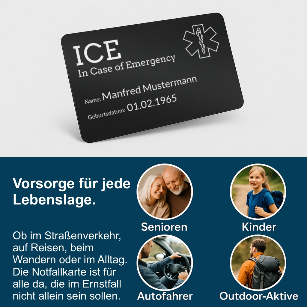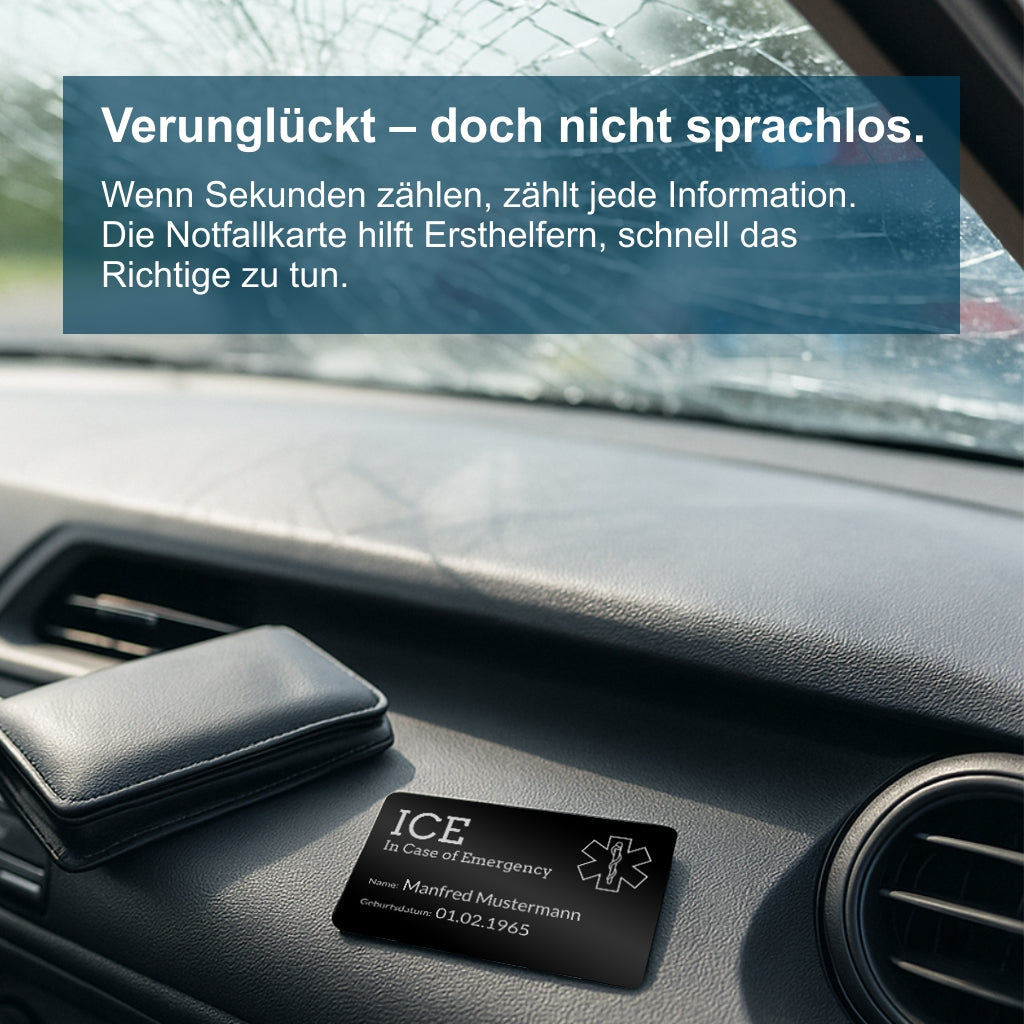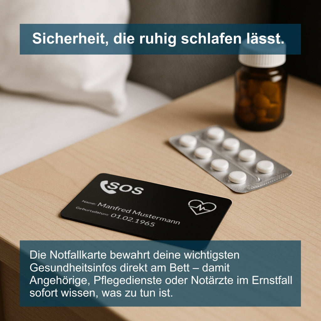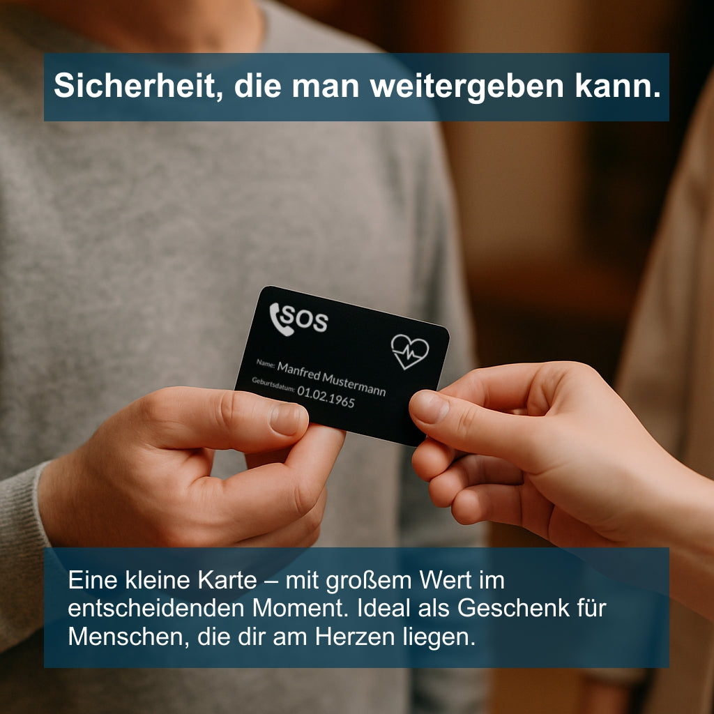 Deine Sicherheit, unterwegs und zuhause. Unsere Notfallkarte aus schwarz-beschichtetem Aluminium ist hochwertig gefertigt und perfekt, um medizinische und persönliche Notfallinfos dauerhaft und gut lesbar zu tragen. Mit präziser Lasergravur zeigen wir deinen Namen, Notfallkontakte, Blutgruppe, Medikamente, Allergien und mehr.
